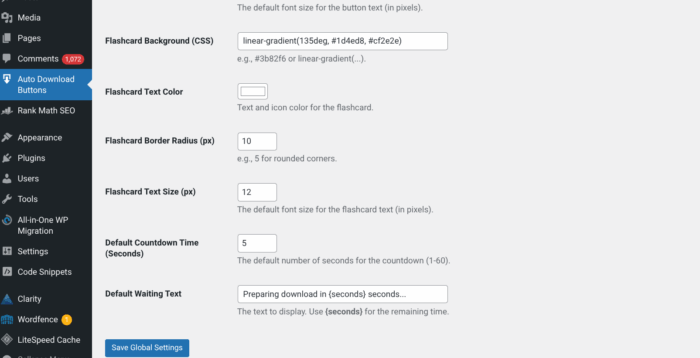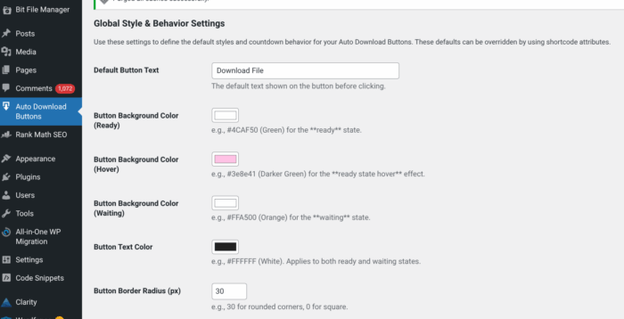 All global configuration options are managed under the dedicated “Auto Download Buttons” menu in your WordPress admin dashboard. These settings apply to all buttons unless overridden by a shortcode attribute.